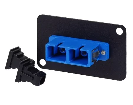 SC Singlemode Duplex Blue Adapter, Polymer Housing, Zirconia Sleeve, Maxxum Dual D Mount, ABS Dust Caps, Adapter Plate(s) and/or Hardware, Adapter Plate(s) and/or Hardware. Black and Blue MIS Colour-Code Caps included.